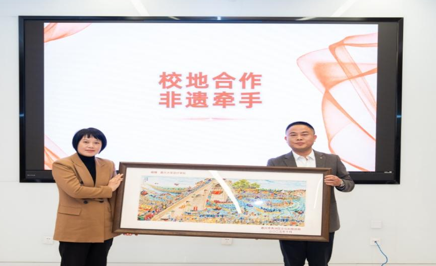 邓宇凡向嘉兴大学设计学院赠送了象征秀洲文化瑰宝的农民画作品《长虹桥》,由设计学院党委书记蒋建其代表接受。这幅作品不仅展现了秀洲农民画独特的艺术风格,更寓意着架起校地合作、文化传承的“连心桥”。