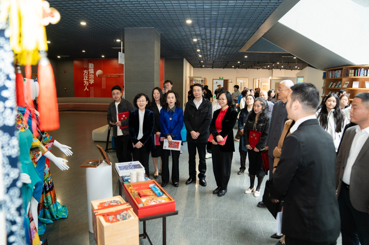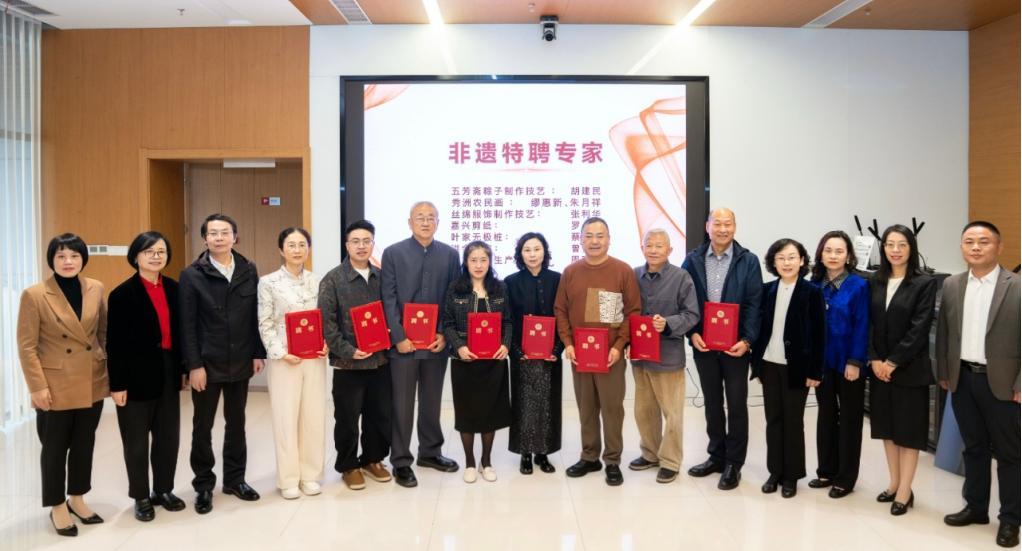 为切实推动非遗技艺的活态传承,嘉兴大学在开幕仪式上正式聘请了胡建民(五芳斋粽子制作技艺),朱月祥、缪惠新(秀洲农民画),张利华(丝绵服饰制作技艺),罗瑶(嘉兴剪纸),蔡光圻(叶家无极桩);曾修权(洪合棕编),周利萍(天福蚕桑生产习俗)等秀洲非遗传承人代表为“嘉兴大学非遗特聘专家”。设计学院院长韦浩为他们颁发了聘书。