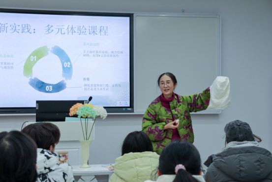 作为设计学院非遗教学体系的重要实践环节,本次活动延续了学院“理论+实践”的教学特色。授课中,周利萍老师围绕“非遗溯源、匠心践行、活态新生、总结展望”四大板块,系统阐释了蚕桑习俗源于江南农耕文化的历史脉络,详解了养蚕、缫丝、制被等核心技艺,以及“女儿红嫁妆蚕丝被”承载的婚嫁文化与民生期许。她结合自身深耕非遗传承的经历,分享了校园推广非遗的实践心得,让师生深刻体会到传统技艺背后的工匠精神与文化底蕴。 设计学院始终注重非遗教学的实践落地,本次讲座中的互动体验环节,正是学院“让非遗走进课堂、贴近学生”教学理念的生动体现。在周老师指导下,同学们亲手参与蚕茧手工抽丝制扇简化版技艺,将传统工艺与创意设计相结合,完成了各具特色的蚕茧花、蚕丝扇面等作品。实践过程中,同学们不仅提升了动手能力与审美素养,更在触摸非遗、创作非遗的过程中,加深了对本土文化的认同与热爱。