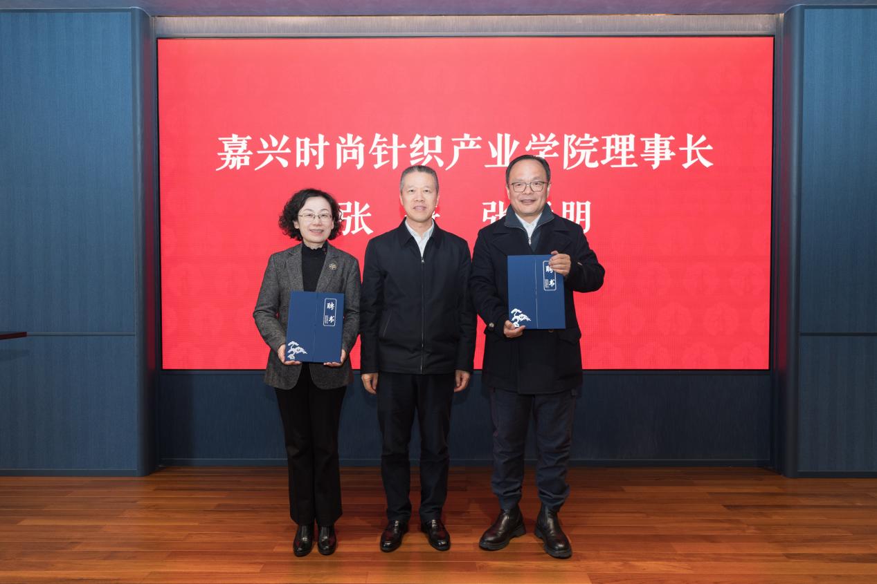 章建通为嘉兴时尚针织产业学院首届理事长张琦、张华明颁发聘书。