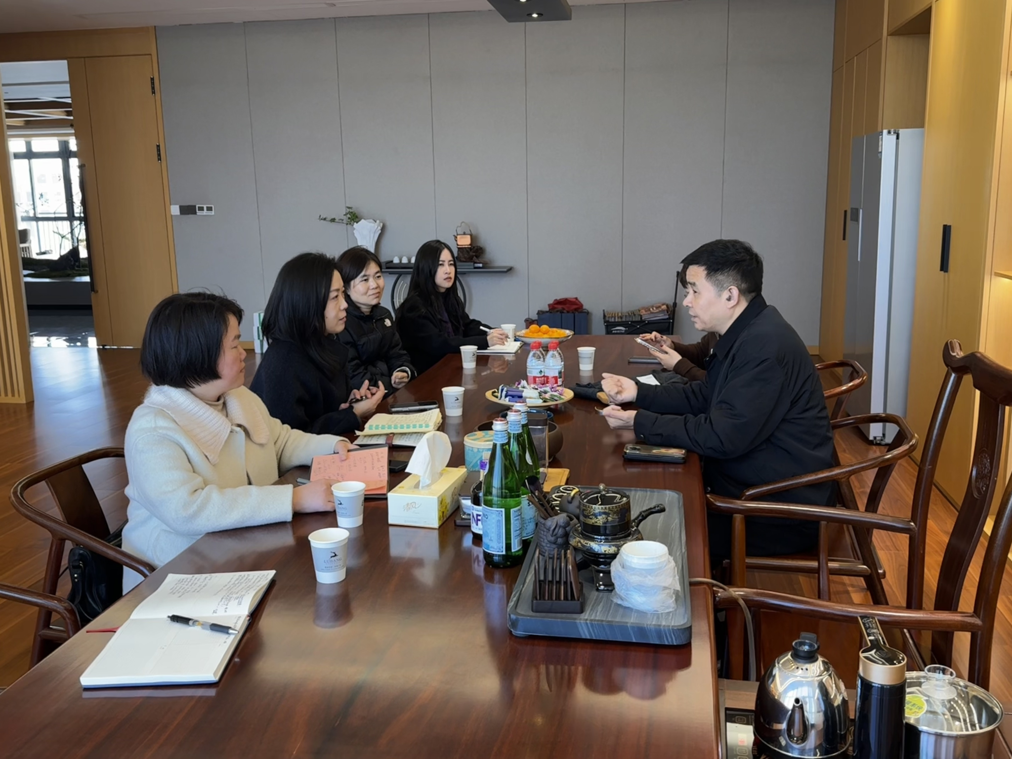 为深入贯彻落实教育部“优企引才”定向访企拓岗促就业专项行动精神,进一步深化校企合作、拓宽毕业生就业渠道,2026年2月,设计学院积极响应学校号召,由教学副院长裘玉英、党委副书记徐蓉带队,服饰专业教师刘艳梅、环设专业教师周琳、学工办侯静平等一行,前往浙江鹿邦羊绒集团开展实地走访与拓岗交流活动。集团董事长叶松海热情接待并进行深入座谈。
