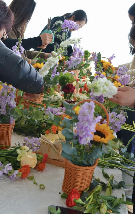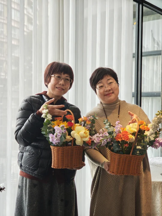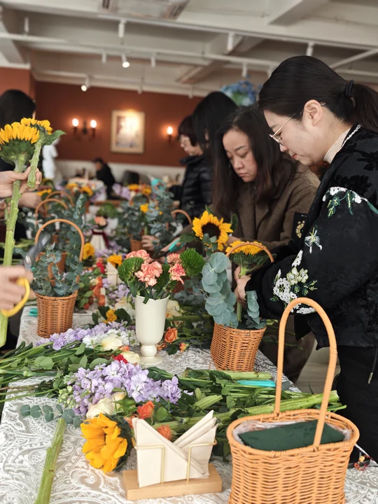 活动现场花香馥郁、氛围温馨,各类鲜切花材错落摆放。在花艺体验环节,大家静心挑选花材、修剪枝叶、搭配造型,将一朵朵鲜花巧妙组合,把对生活的热爱与对美的追求融入指尖,创作出一束束层次丰富、独具韵味的花艺作品。