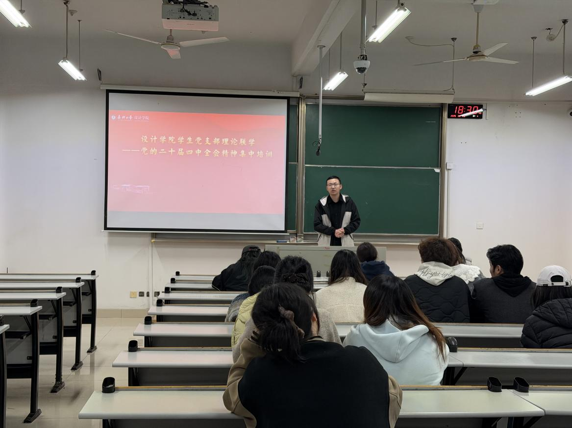 为深入学习贯彻党的二十届四中全会精神,强化学生党员理论武装,筑牢理想信念根基,切实把思想和行动统一到党中央决策部署上来,3月26日晚,设计学院学生党支部组织开展本学期第一次理论联学暨党的二十届四中全会集中培训活动,学院全体学生党员参加培训,组织员颜姚炜主持活动。