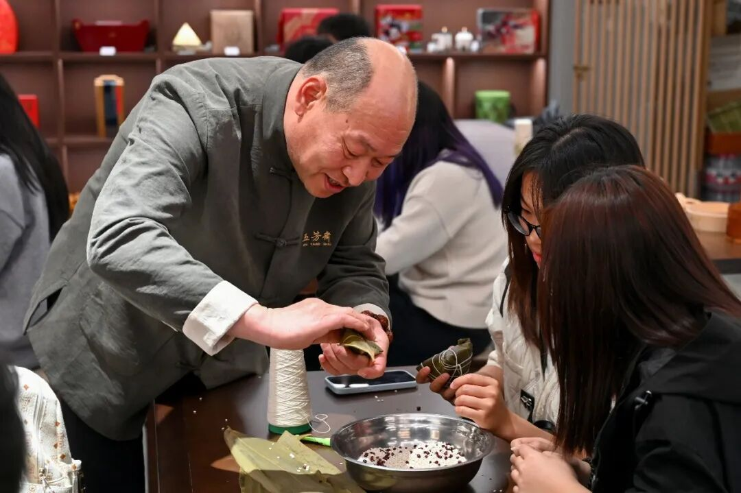 此次课程是嘉兴大学首开《非遗创新与品牌运营》微专业的重要实践环节。作为嘉兴大学浙江省非物质文化遗产传承教学基地负责人,周琳老师长期深耕产教融合,此前已带领视觉传达设计专业学生开展“嘉兴大学设计学院×五芳斋非遗工作坊”,完成非遗体验馆馆标、IP“糯糯龙”表情包及系列文创成果。2024年双方签署战略合作协议后,从非遗工作坊到微专业的进阶路径日益清晰。本次教学中,非遗传承人胡建民老师不仅演示了四角粽的捆扎绝技,更分享了百年老字号通过品牌创新让非遗“活”在当下的实践经验。这种“高校教师+非遗传承人”的双导师模式,让同学们直观学习了“非遗+商业+文旅”的创新运营逻辑。