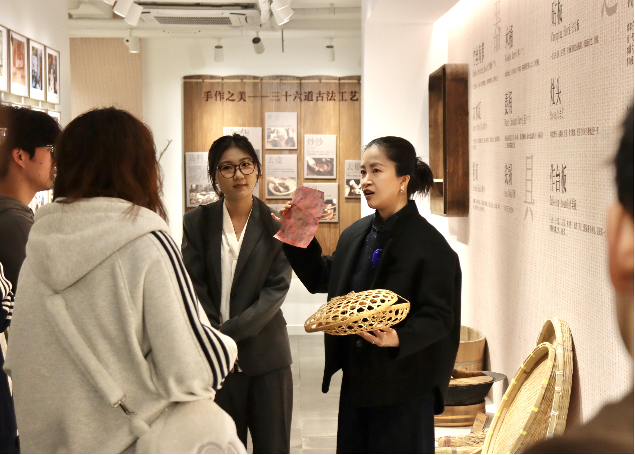 4月12日,嘉兴大学设计学院周琳老师带领首批非物质文化遗产微专业23名学生,走进五芳斋建国路总店非遗体验馆,开展《非遗创新与品牌运营》课程的现场教学。这座集餐饮、零售、博物馆和非遗研学于一体的空间,由周琳老师团队于2024年为五芳斋倾力打造,已先后荣获浙江省非遗工作站、省级非遗茶空间和第一批省级非遗美学生活馆等多项省级荣誉。在工作人员引导下,同学们参观了从马家浜糯稻溯源到五芳斋粽子三十六道工序的完整展陈,近距离感受了非遗活态展示与数字化运营的创新融合。随后,国家级非遗项目五芳斋粽子制作技艺传承人、嘉兴大学特聘非遗专家胡建民老师亲临现场,为学生们带来一堂生动的“非遗大师讲堂”。